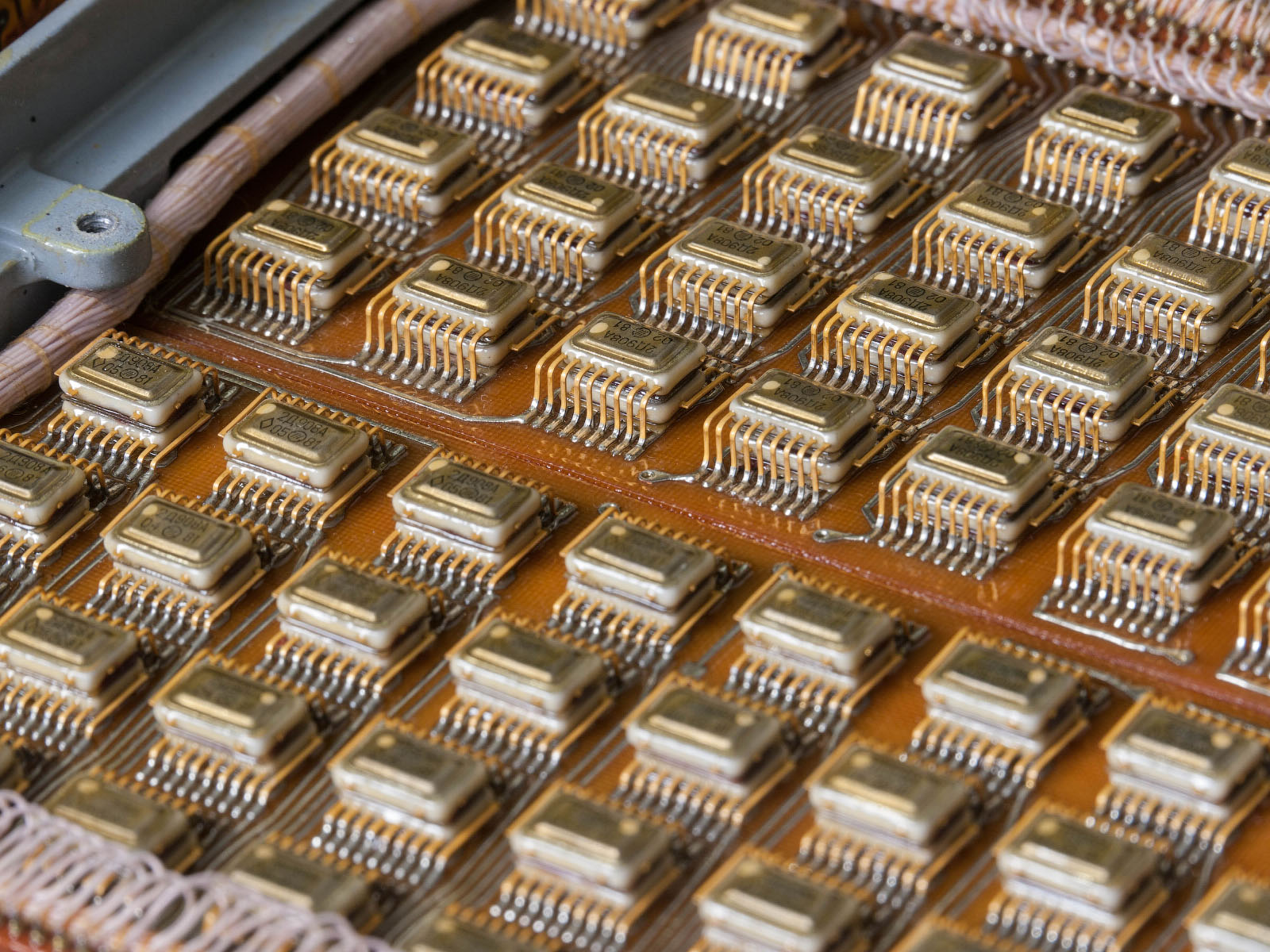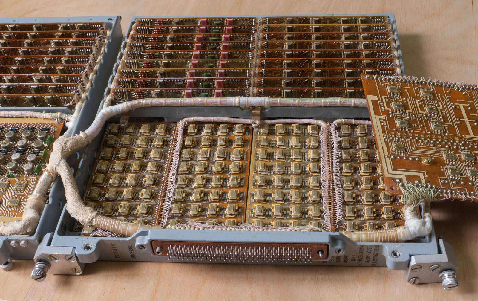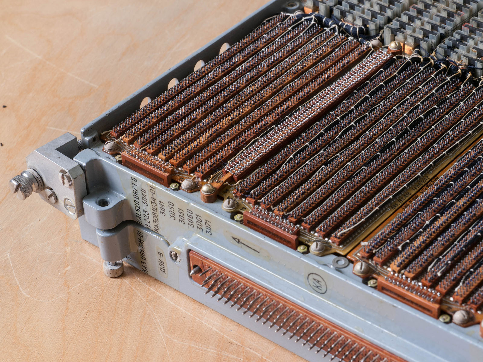 Each half of the case consists of two sections. One of them is occupied by storage U-shaped ferrite cores, and the second is occupied by the terminals of code wires (address buses) and electronic boards in two layers. The cores are accessed from the side of the protective covers. The entire memory part can be divided into four sections, two on each of the halves. Each of the halves consists of 144 cores (8 rows of 18 pieces), but is logically divided in half, which gives eight groups of 72 cores. The total number of cassette cores could be 576, but one group (72 cores) is left unstitched. The code wires are also divided into four sections, each 1024 wires. Thus, the memory capacity is 9 kilobytes per group, and the entire cassette is 63 kilobytes. If it had not been for the stitched group, the memory size would have been 72 kilobytes. On the opposite side of the ferrite cores there are narrow printed circuit boards with integrated circuits responsible for the operation of the reading system.