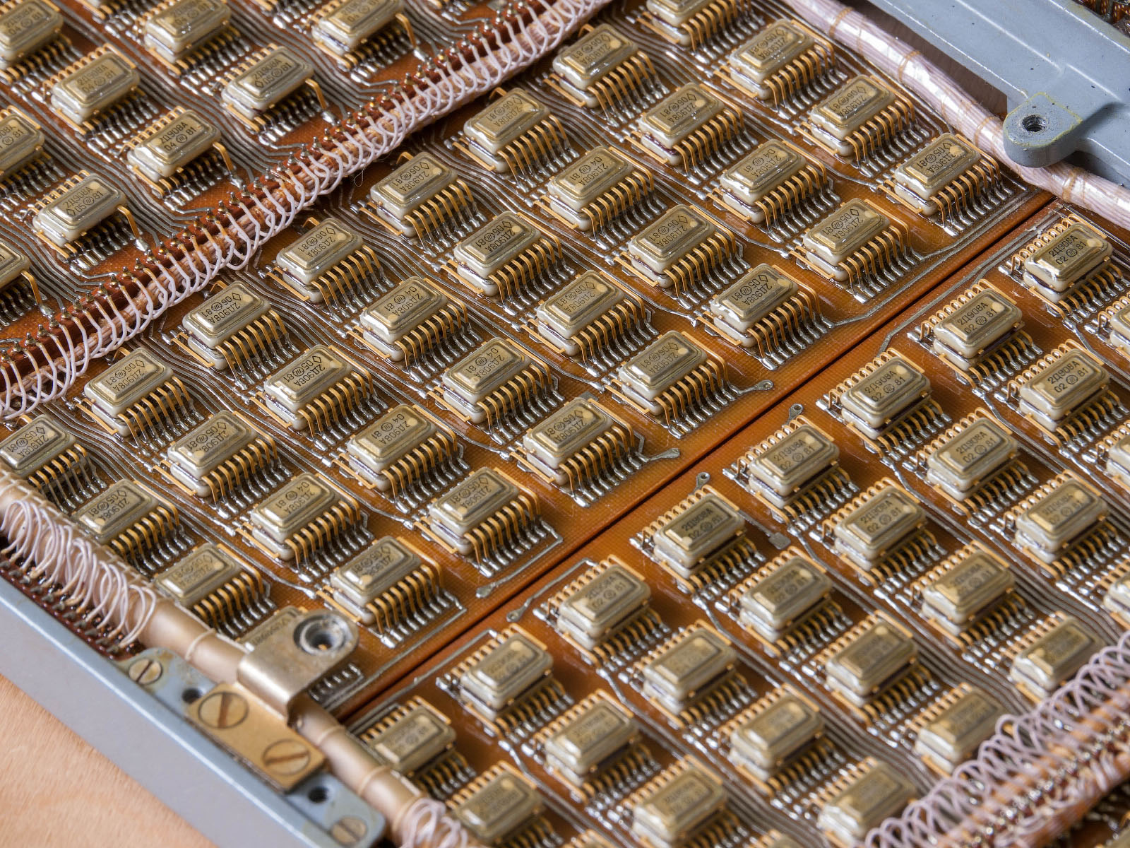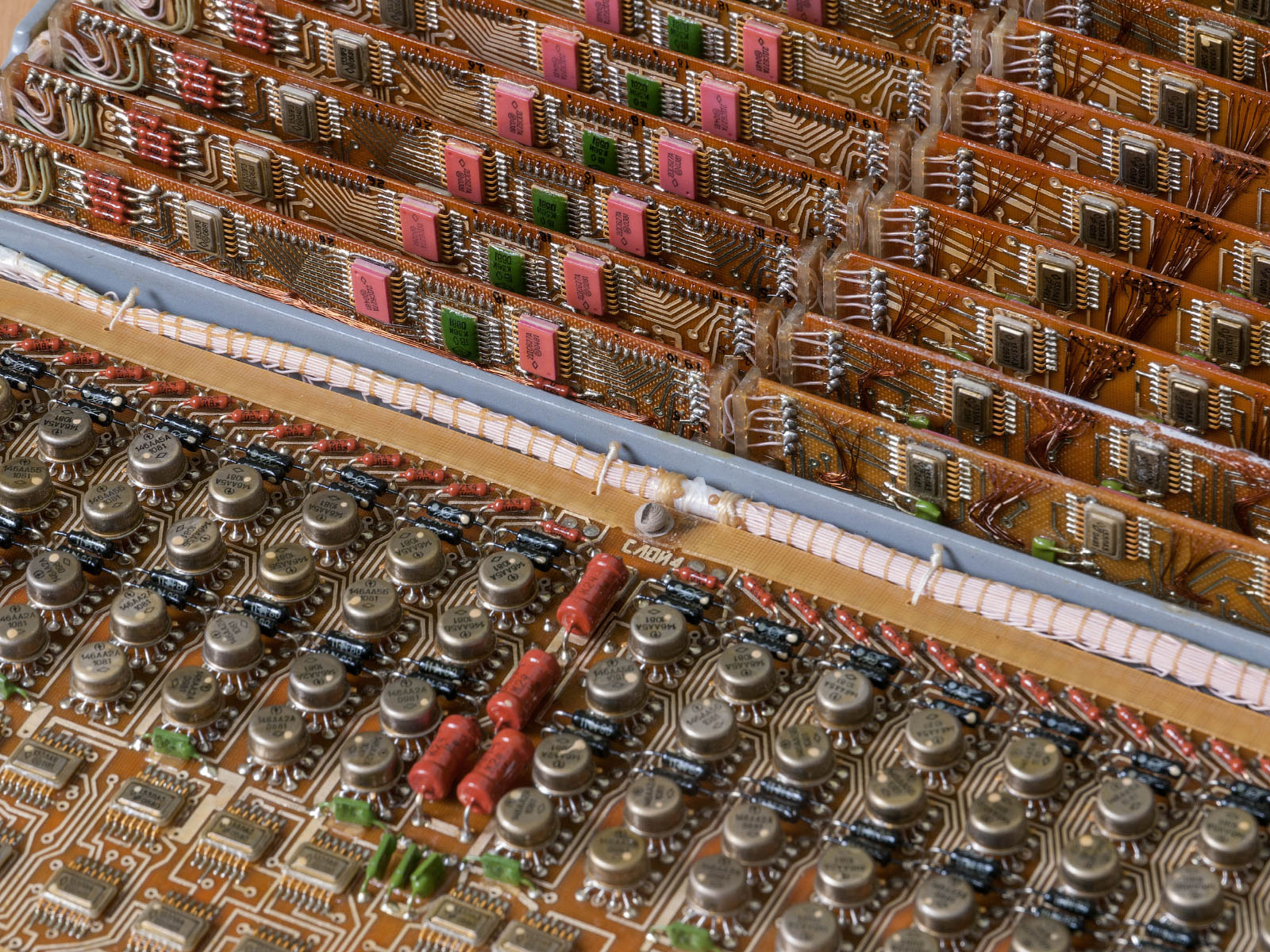Other areas are occupied by printed circuit boards with a variety of logic elements. The boards are placed in two layers, on the lower ones there are diode assemblies - decoders. Due to the need to accommodate a large amount, an interesting sandwich montage was used.